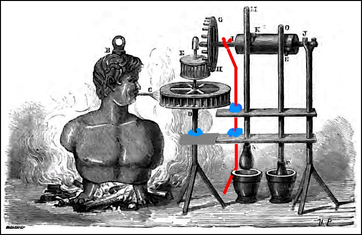 1. Плохо видно и поэтому непонятно, как вал I J слева закреплен. 2. У диска G и барабана E явно разный шаг зубцов. 3. Опять же плохо видно, но визуально кажется, что трубочка C направлена в середину диска D. В таком случае диск D вращаться не должен, струя воздуха должна бить в заднюю (от нас) часть диска. 4. Не понятен источник движущей силы. Разве что если человек - это такой стилизованный сосуд с водой (кстати, и пробка на голове наталкивает на такую мысль). В этом случае пар из трубки во рту может выходит с какой-то силой. ... |
