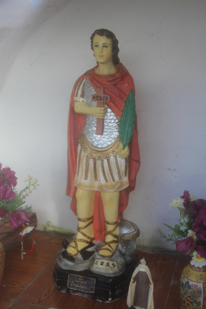 Один из самых почитаемых в Чили святых Святой Экспедито. По названию понятно что он покровитель путешественников и туристов. По происхождению он арменин, по профессии военный. По призванию - мученик. Держит крест с надписью "Сегодня" и ногой попирает ворона олицетворяющего "завтра". Вобщем от него и пошло: "Живи сегодняшним днём" ... |