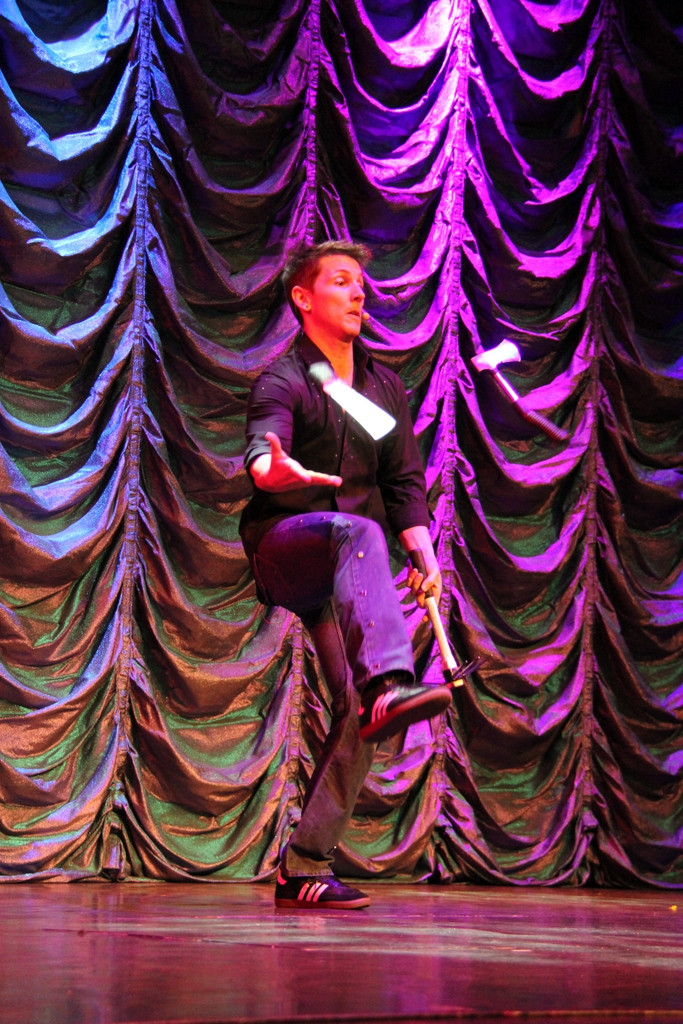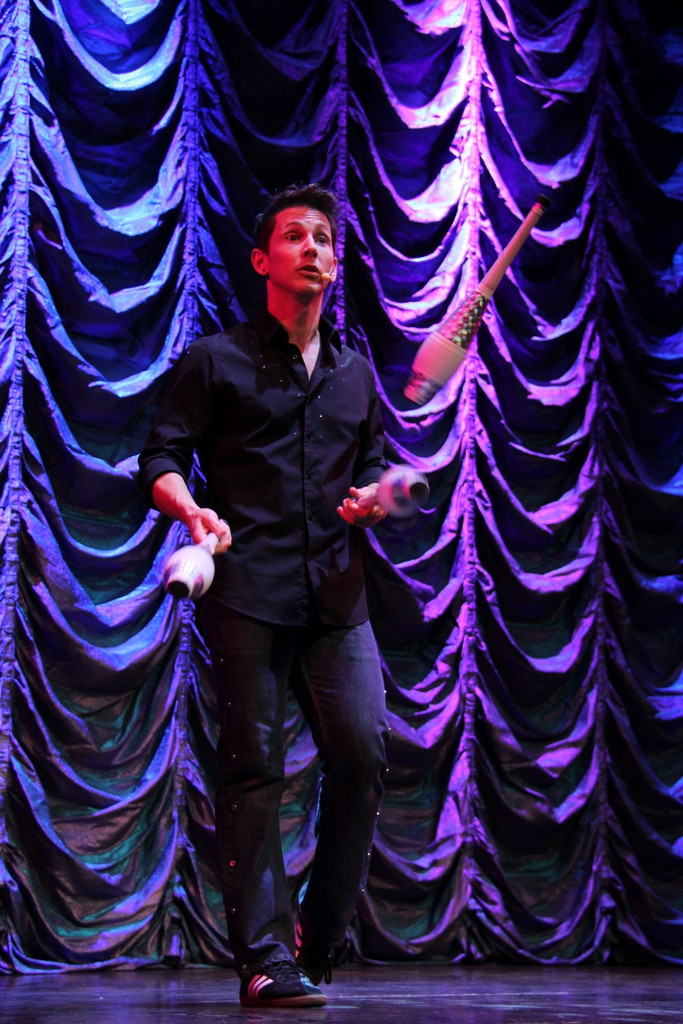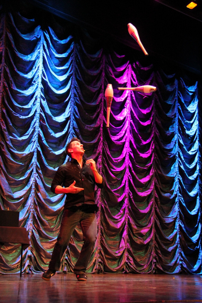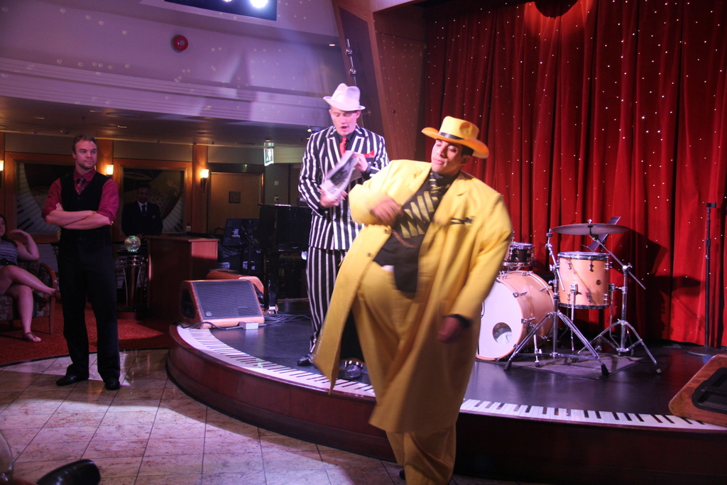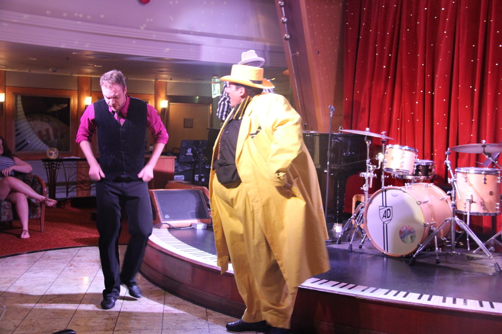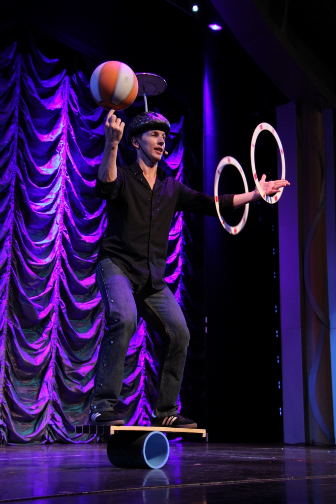А вот выступление жонглёра. Как раз в тот вечер была сильная качка, не представляю как он справлялся.Чувиха из зала ему хорошо подмогла ... |