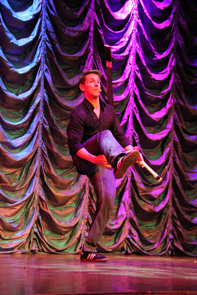 На голове крутится тарелка, на пальце крутится мяч, а на руке крутятся два кольца, а сам крутится на цилиндре. ... |