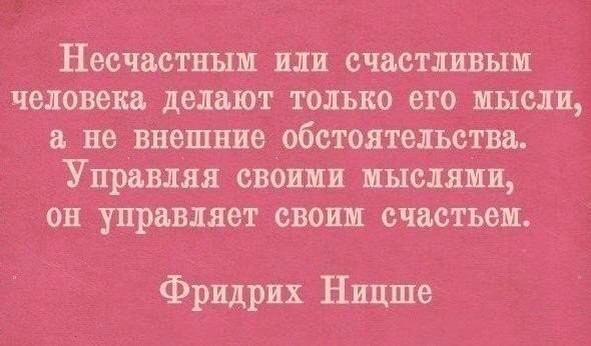 Программизд 02 Счастье это субъективное ощущение, нестабильное изменчивое. Это не сами события или обстоятельство, а их восприятие человеком. Не раз наблюдал случаи когда в один день человек ощущал себя счастливым, а на следующий уже удрученным и депрессивным, хотя в обстоятельствах ничего не поменялось. ... |