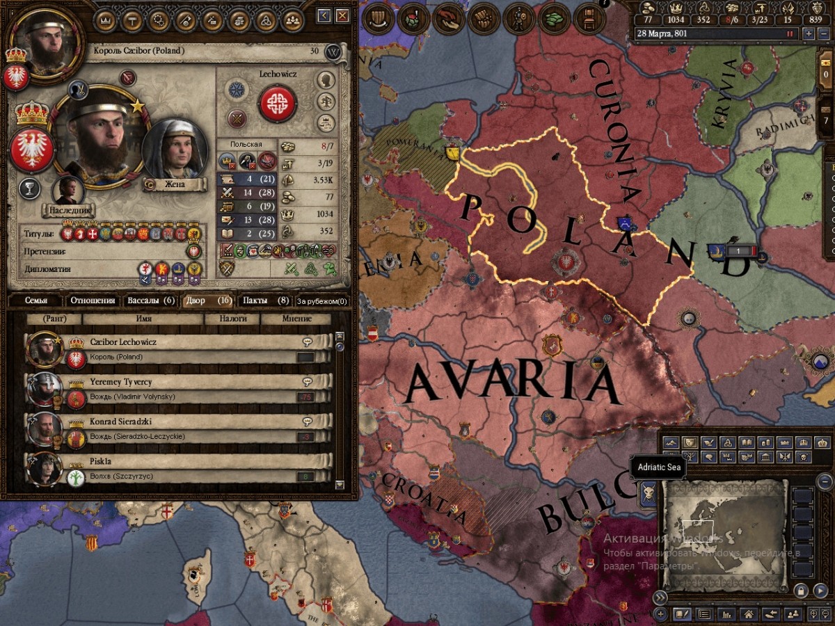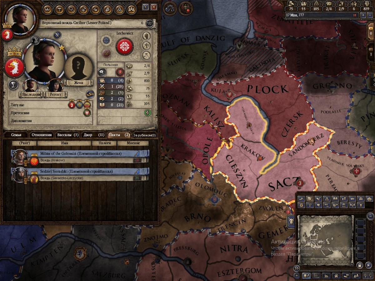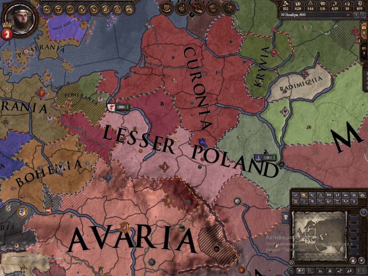 Antonariy 13.08.2018, 22:56 как-то быстро события развиваются в игре прошло 32 года. первый вождь успел помереть, почти собрав Польшу. а его сын, будучи молодым, таки сначала пошел на восток, захватил Волынь, сделал данником Киев(женился на богемской принцессе создав альянс с Богемией и поевал в паре войн Богемии против Аварии). Ну и сделал данником Силизию. Да, пытаюсь действовать быстро. Но меня сильно пугает то, как развилась на север от меня Курония. Прибалты таки выглядят серьезной угрозой. И армии у них мощные... Даже не знаю что с ними делать. ... |