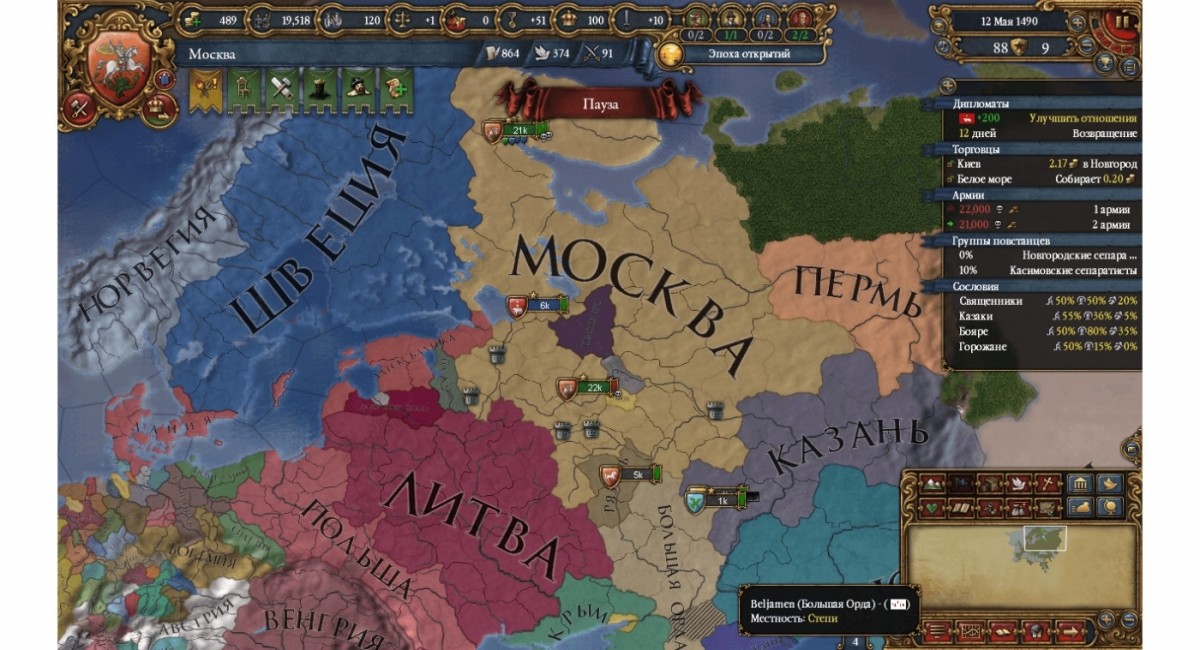 да разница в 3 теха(хотя к концу довел до 2) - это жесть, даже в три раза большим войском - насасывал. разве только микроменеджмент, когда полки постепенно вводишь в бой, помогал 60-ю тысячами - завалить 13 тысяч. деньги тратились, долгов набрал, а ляхи всё больше и больше крепостей и территорий захватывали. потому я решил предложить мир пока ещё больше не залез в долги, и пока Польшя ещё больше "очков победы" не набрала. пришлось отказаться от претензий на земли литвы и отдать половину захваченных у орды земель... розовеньким выделены те провинции, что я отдал ляхам клятым... ... |
