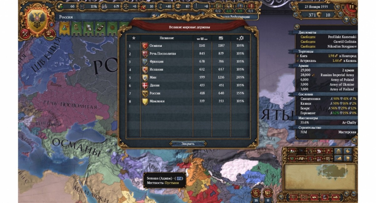 Хочу идти на восток, но на западе два сильнейших врага, Османы и Ржечь Посполитая. Я на 7-м месте великих держав, а они на 1-м и 2-м... ... |