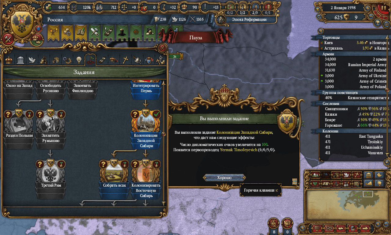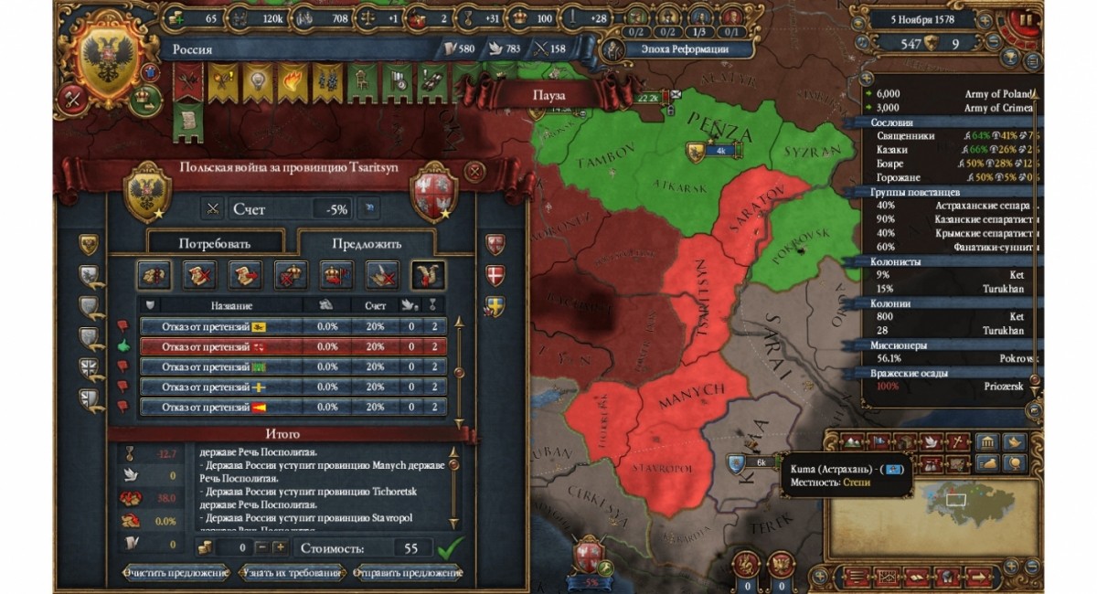 да, отставание на 2 теха опять дало о себе знать. еле-еле своими 80-ю тысячами, два десятка поляков победил... а там ещё с севера на Псков датчане набежали. я поскорее поспешил заключить мир, отдал земли от Саратова то Ставрополя ляхам(включая и Сталинград). ползет Россия понемногу в сторону северо-востока, теряя земли на югозападе.... ... |