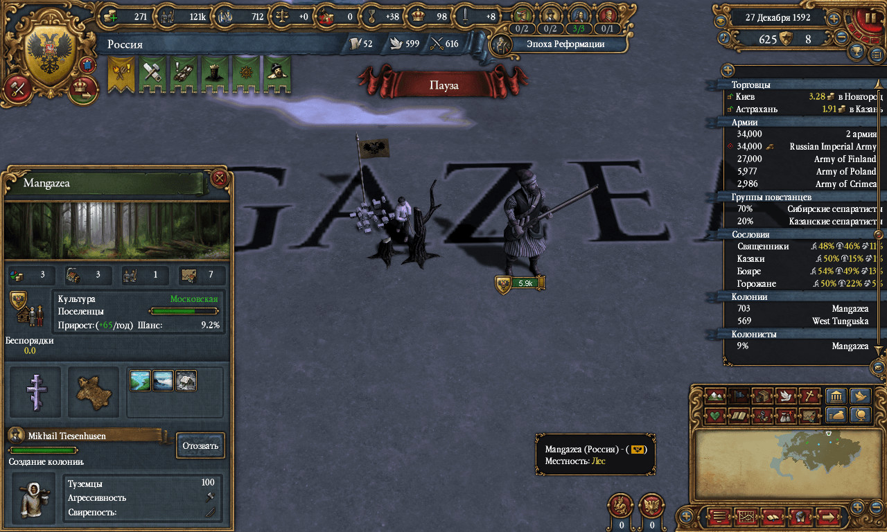 3_po 04.10.2018, 20:35 ZyK_BotaN А тут ещё, с последним патчем, для тех у кого этот ДЛЦ завезли уникальные ветки заданий/фокусов, для Московии, Новгорода, России(которую можно сформировать) но вот добрался до колонизации такого знакового места, как Мангазея. Благодаря порту, перетяну на себя хороший кусок торгового влияния с сибирского торгового узла, а то сейчас, все на себя среднеазиаты в Самарканд перетягивают, а в мой Казанский центр - 0 денег доходит... вики Мангазея — первый русский заполярный город XVII века в Сибири. Располагался на севере Западной Сибири, на реке Таз в месте впадения в неё реки Мангазейки. ... |