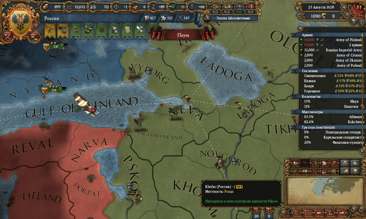 Вступил с Сосманом в союз ещё давно, после того как я встрял в войну великих держав, где на одной стороне Речь Посполита и Дания, на другой Осман. И вот теперь Османы напали на Речь, что-бы ещё кусок земель отобрать, ну я и происоеденился. Когда уже почти выгирали, хотел схитрить и выйти из войны отобрав территорий кусок у Речи. Но мне хватала моего военного счета только на два куска... И тут я не успел, Осман заключил перемирие, и о чудо, он был щедр. От Польши он только себе набрал территорий, а мне зато передал две датские и одну шведскую: Ингрию, Неву(место где Питер) и Выборг, теперь я получил выход к финскому заливу, спасибо османам: ... |
