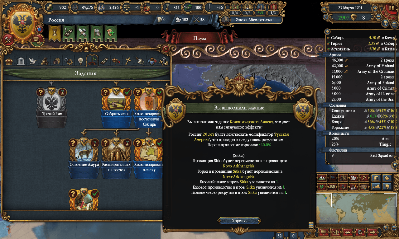 ZyK_BotaN 07.10.2018, 12:08 так насасываю в еврорпе от речи посполитов и отстаю в технологиях(в том числе и наверстать сложно, ибо чем дальше от европки - тем медленнее развитие. ну и таки занялся колонизацией аляски, может и до калифорнии руки дойдут... ... |