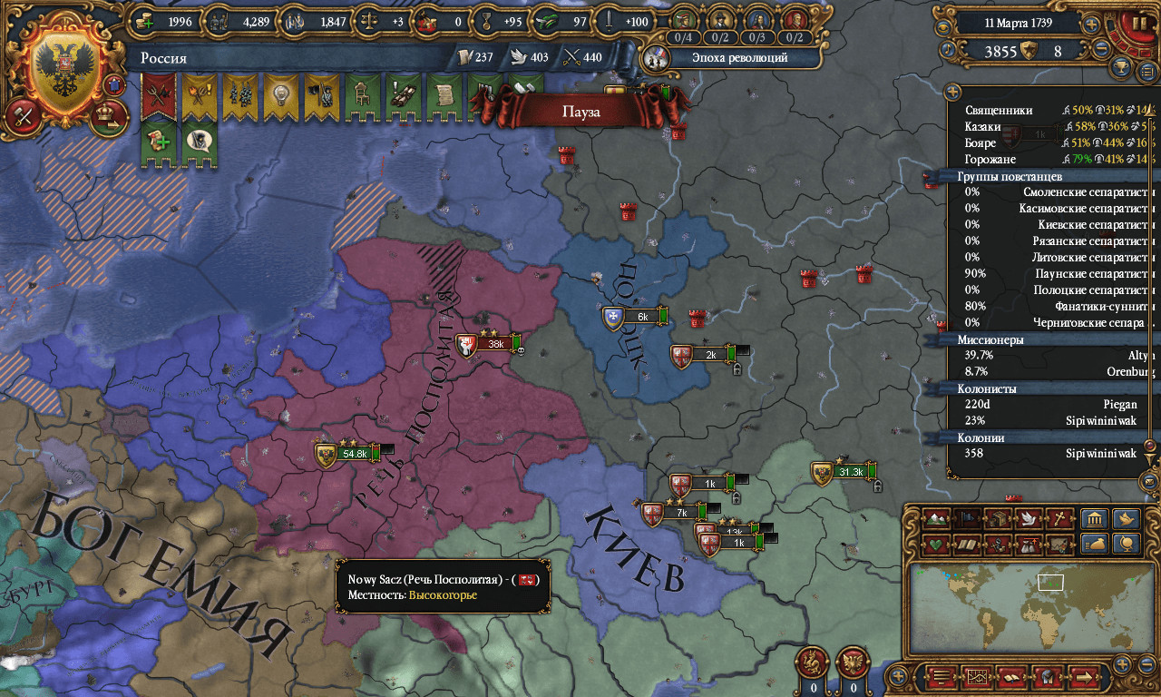 Решил на легке выйти к каспийскому и аральскому морям - напал на Трансоксиану, насосал немного.. сам потерял ещё и северного казахстана кусок.. Восстановился, увидел что Трансоксиана воюет, вернул земли, еще немного отобрал. А потом - просто подарок, сначала Франция Речь Посполита нагнула, дав независимость Полоцку и Киеву(и землям вокруг них). Так ещё и Осман на Речь напал, я опять воспользовался, и как шакал подобрал себе земель ржечевских кусок + Полоцк взял в союз и улучшаю отношения, что-бы сначала по доброму завассались, а потом и присоединить. ... |