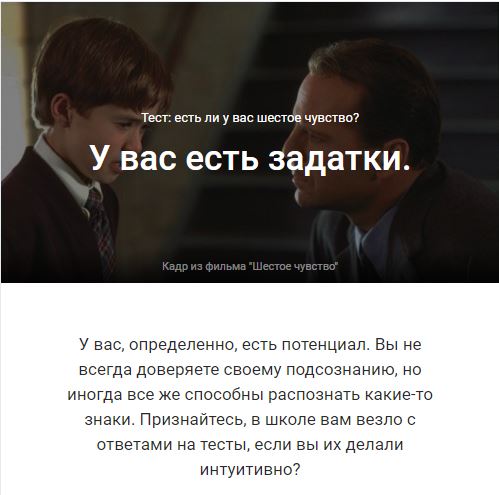 Цитата Тест: обладаете ли вы шестым чувством?.В жизни каждого человека хотя бы однажды происходило что-то необъяснимое, не поддающееся логике. Разнообразные "странные" вещи часто называют шестым чувством. Считается, что у каждого человека есть пять чувств: слух, зрение, обоняние, осязание и вкус. Но у некоторых существует и это необъяснимое шестое. Его еще называют интуицией или эмпатией. Как часто вы принимали решение, основываясь на логике, но в последний момент действовали совершенно по-другому, просто потому, что у вас было ощущение, что так будет правильно? О том, что такое интуиция спорят уже долго. Ни ученые, ни психологи не могут понять, как именно "работает" шестое чувство. И от чего зависит его наличие или отсутствие у разных людей. Многие считают, что у женщин интуиция развита сильнее. Другие думают, что на самом деле это из-за того, что женщины более эмоциональны и реже руководствуются логикой. Но, если честно, шестое чувство бывает развито и у мужчин, поэтому и такие версии не выдерживают никакой критики. Предлагаем вам ответить на вопросы нашего теста и проверить, насколько шестое чувство развито у вас. Прошли 158578 человек. https://woman.rambler.ru/psychology/38728705/ ... |