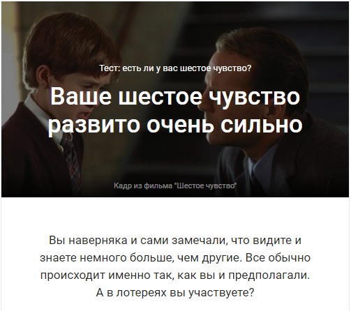 Цитата Тест: обладаете ли вы шестым чувством?.В жизни каждого человека хотя бы однажды происходило что-то необъяснимое, не поддающееся логике. Разнообразные "странные" вещи часто называют шестым чувством. Считается, что у каждого человека есть пять чувств: слух, зрение, обоняние, осязание и вкус. Но у некоторых существует и это необъяснимое шестое. Его еще называют интуицией или эмпатией. Как часто вы принимали решение, основываясь на логике, но в последний момент действовали совершенно по-другому, просто потому, что у вас было ощущение, что так будет правильно? О том, что такое интуиция спорят уже долго. Ни ученые, ни психологи не могут понять, как именно "работает" шестое чувство. И от чего зависит его наличие или отсутствие у разных людей. Многие считают, что у женщин интуиция развита сильнее. Другие думают, что на самом деле это из-за того, что женщины более эмоциональны и реже руководствуются логикой. Но, если честно, шестое чувство бывает развито и у мужчин, поэтому и такие версии не выдерживают никакой критики. Предлагаем вам ответить на вопросы нашего теста и проверить, насколько шестое чувство развито у вас. Прошли 158578 человек. https://woman.rambler.ru/psychology/38728705/ ... |