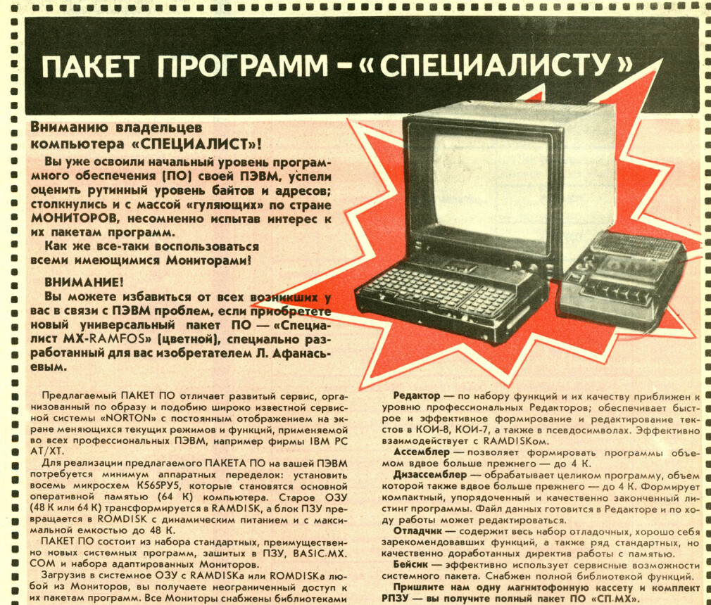 В журнале моделист-конструктор от 1995 года наблюдается какая-то It-Тишина. Прошивок под Специалист почти не публикуют. Всё идет традиционный поток археологии. Модели танчиков и самолетиков. Но вот удача. Ритм-установка своими руками. Я просто не смог пройти мимо. Кстати оцените. По 512 байт на семпл. И всего 4 инструмента. ... |