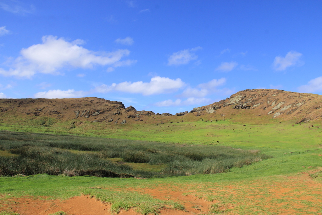 Это жерло того самого вулкана. Видно что гора серьёзно пострадала от человеческой культурной активности.Внутри вулкана тоже была серьёзная производственная активность. Совсем новые статуи готовы к доставке клиентам.Тут-же пасутся полудикие лошади. ... |