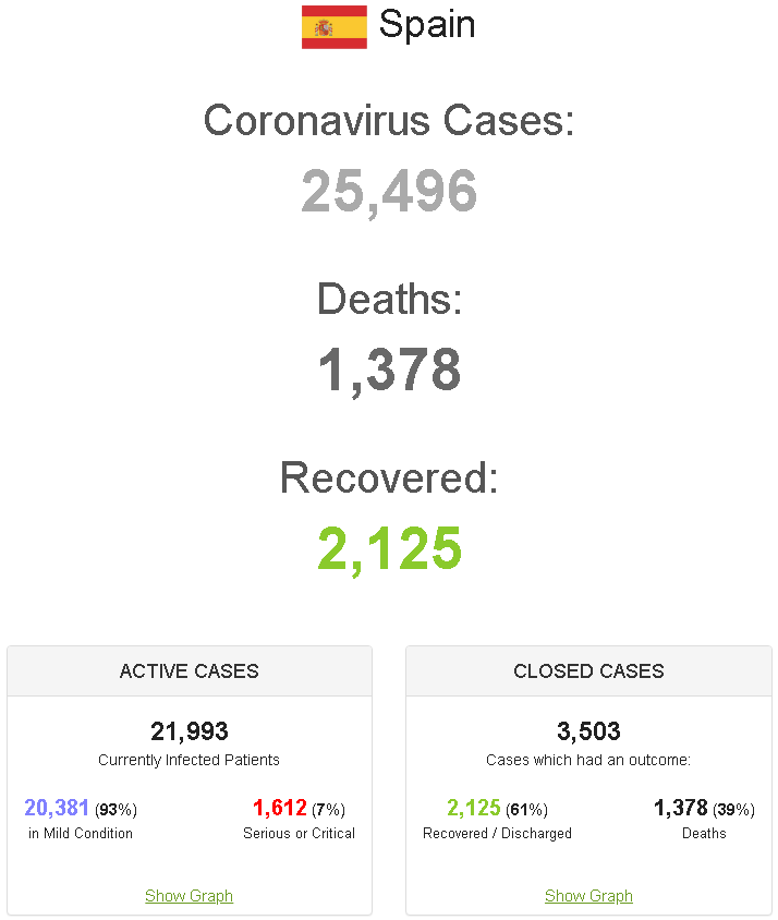 Burgos 21.03.2020, 23:16 Здесь приводят отношение выздоровевших и умерших, надо иметь в виду, что "выздоровевшие" это те, кто были выписаны из больниц, а не те кто вообще переболел коронавирусом. Вот смотрим данные по Испании: 1. Из ВСЕХ, когда-либо протестированных выявлено 25,496 заболевших. 2. Из всех выявленных выздоровело 2,125. 3. Из всех выявленных всё ещё больны 21,993. 4. Из всех кто ещё болеют 1,612 находятся в критическом положении. 5. Из всех выявленных умерло 1,378. 6. Нет никакой информации сколько из всех выявленных было госпитализировано или выписано из больницы. Любые спекуляции на эту тему и без подтверждённых цифр - это гнусные инсенуации. ... |